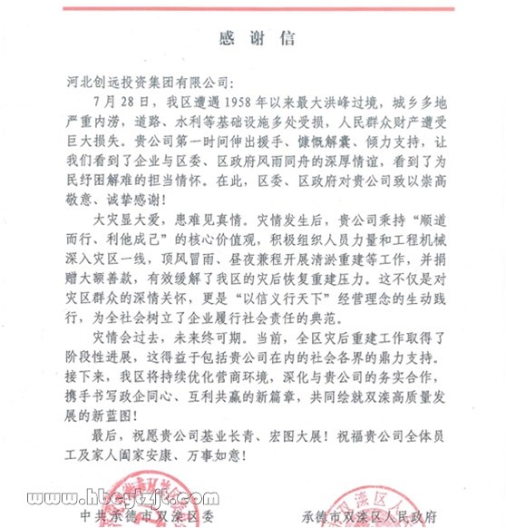 近日,承德市雙灤區區委、區政府向河北創遠投資集團發來感謝信,對創遠集團在今年抗洪搶險期間第一時間伸出援手、與區委、區政府和當地群眾風雨同舟的深厚情誼,表達了誠摯的感謝。